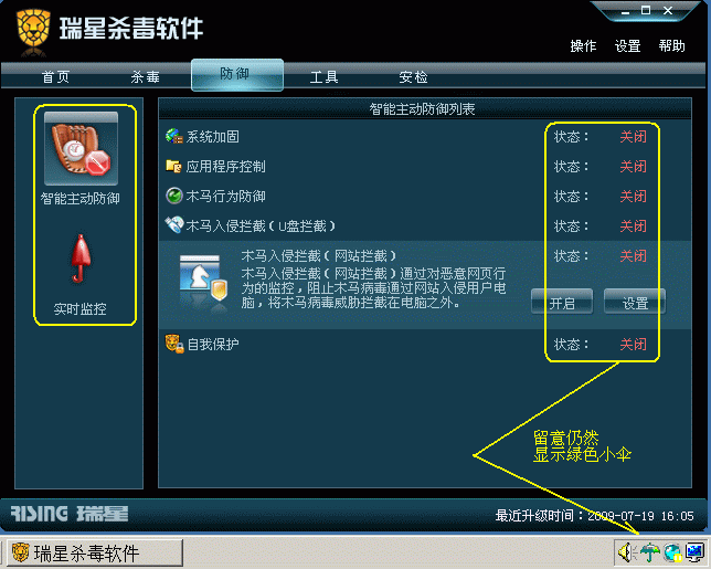 但系统通知区域的小伞在所有监控已被关闭后仍然维持绿色状态,