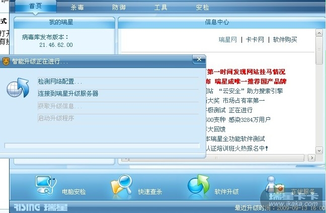 我好几天没有上网,今天打开电脑,我先升级防火墙可以升级,但是杀毒软件却不能升级。我的病毒库版本是21.46.62.00,不知道是不是最新版本,我选择软件升级的时候没有提示是最新版本,但没出现升级的界面,这是怎么回事?我的防火墙升级正常!希望高手支个招。万分感谢!