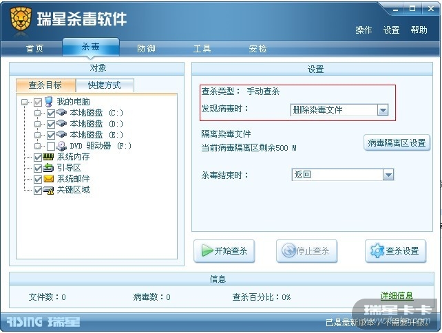 请楼主打开瑞星后,重新设置发现病毒时为:“清除病毒”或者“询问我”。