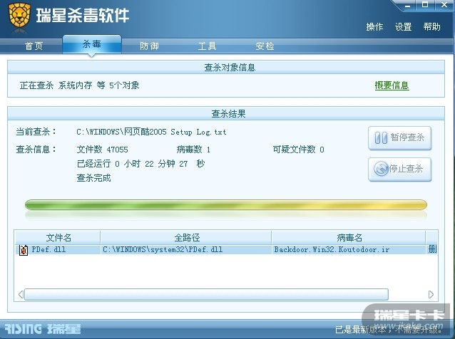 刚刚用瑞星查杀病毒时发现这个Backdoor.Win32.Koutodoor.ir. 杀毒失败.在网上查了一下,也没有找到有用的资料,不知道如何处理.哪位大侠可以帮帮我呀? 最讨厌的是我的浏览器主页总是被自动修改成