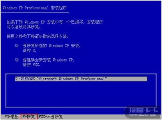 选择接受“WindowsXP 许可协议后” 安装程序会检测系统的情况,并提示进行“修复”或“全新安装”,按“R”键 执行修复所选的Windows