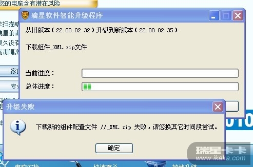 估计是楼主电脑的系统有问题吧,我的瑞星升级很正常!建议重新再升级一下试试?实在不行的话,就用添加/删除组件修复一下瑞星。然后再升级!以上都不行,建议楼主与客服联系。