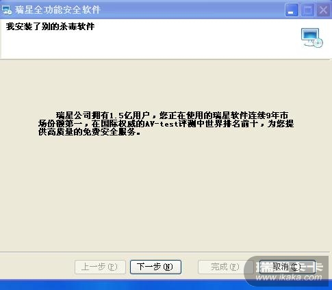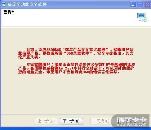 我使用瑞星全功能有点卡,就像换回瑞星杀毒,在卸载全功能的时候,瑞星出现了一行红字:瑞星是获得AV-Test什么什么奖的产品。我一下子没看清楚就给确定了。