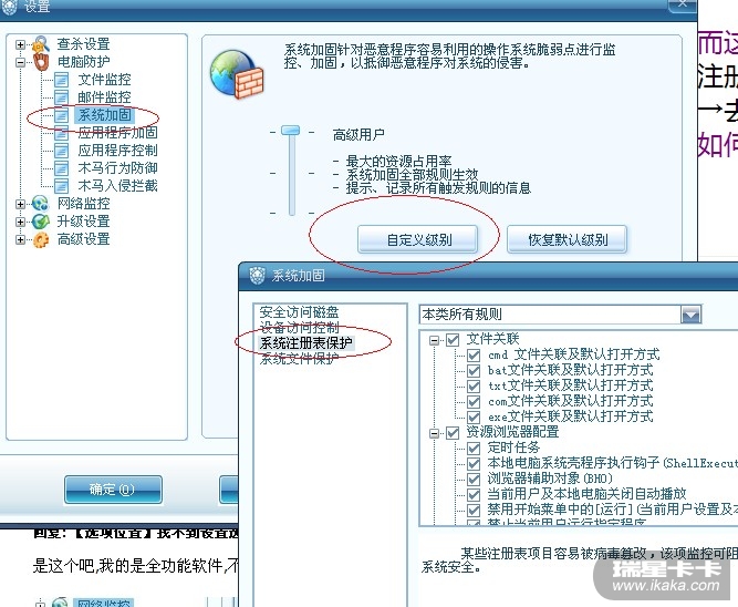 去掉“注册表实时监控”选项。瑞星防火墙详细设置→网站访问规则→保护→去掉“网址过滤”