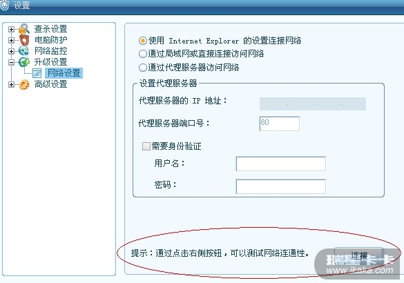防火墙能升,杀毒不能升,说明你的计算机网络是没有问题的,很有可能是软件升级设置出问题的情况,建议选择升级界面的直接使用Internet Explorer的设置连接网络,或者试一下局域网或直接连接的方式,然后点下面的连接按钮测试一下.
