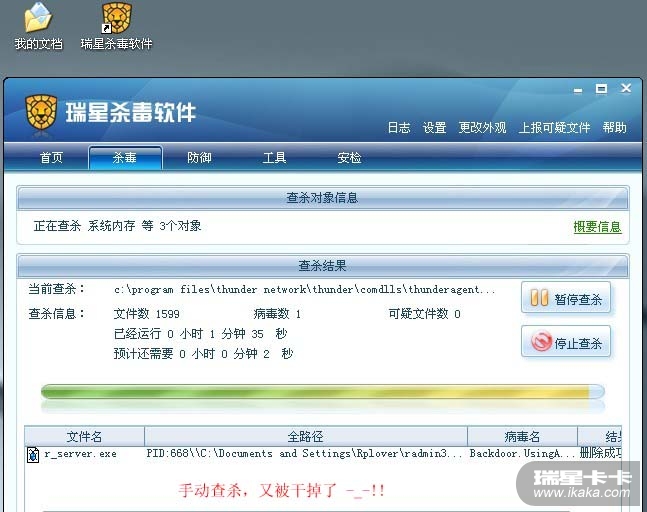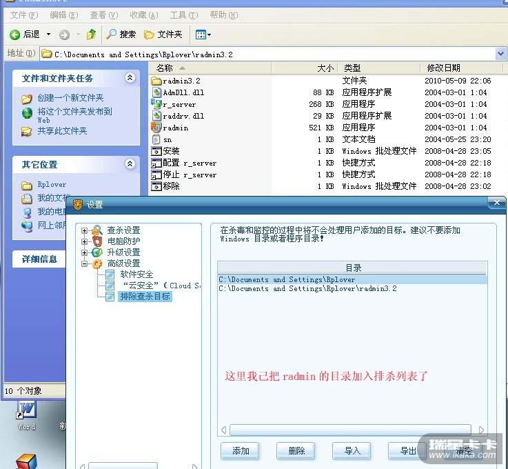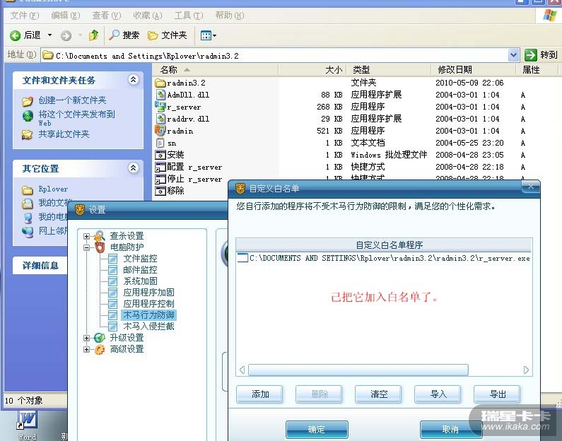 我一个远程用的工具,Radmin。明明在瑞星里加了木马规则白名单了,再试下手动杀毒,又把它给干掉了,晕死啦。。。。。。