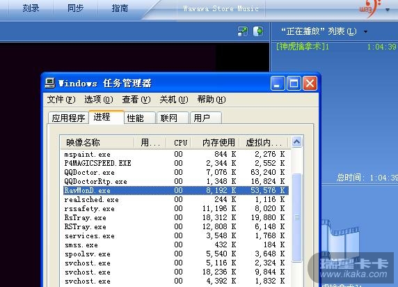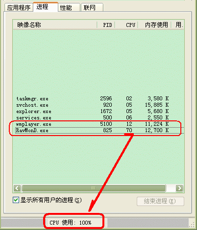 例一:运行 xp 内置媒体播放器,播放音频或视频文件时 RavMonD 进程占用大量处理器时间,特别是用户在媒体播放器面板上点击 “暂停” 按钮后情况更为明显(参见图一)。将媒体播放器进程加入 Rav2010 信任白名单无法解决问题。