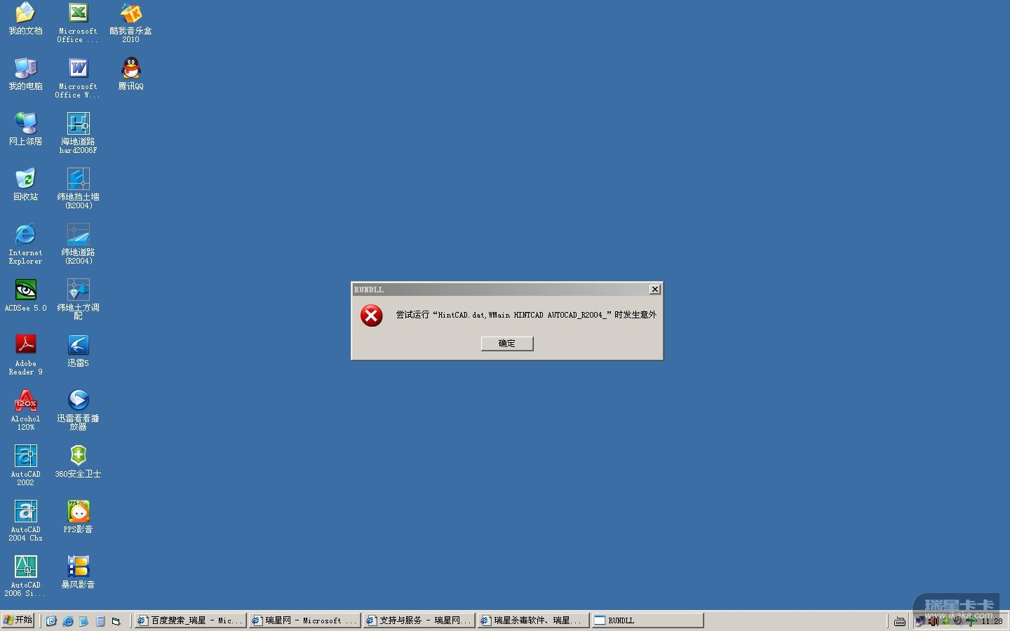 请楼主提供瑞星的当前版本,大概描述一下【纬地道路(R2004)】的工作原理,并且逐一关闭瑞星监控,查看是哪个监控导致。