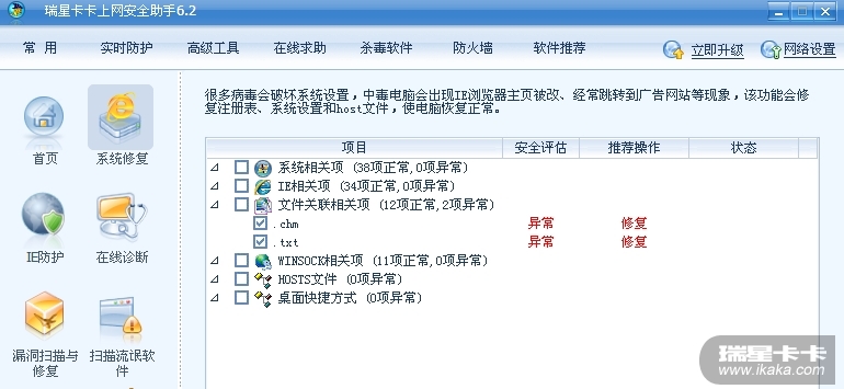 估计有木马,安装后浏览器网址多了一个后辍,如2345.com/?。多了个问号。而且网页顶端即地址栏下面会多出一个369游戏网址的东西。虽然用卡卡修复了这两个问题。但是经常使用卡卡系统修复功能时都出现这样的情况: