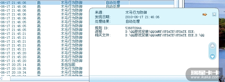 我的电脑刚刚安装瑞星2010全功能版,每次打开QQ游戏日记里面都有木马防御,用卡卡也杀不到木马,重新安装游戏后还是这样,请教这是我的电脑已经中马了吗,该怎么办?