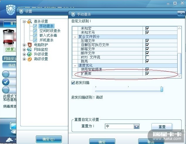 有些老病毒在新的操作系统中已经无法正常运行了,所以瑞星放在了扩展库中,如果希望查出,楼主可以如图设置,勾选扩展库,或将查杀级别设置为高级。