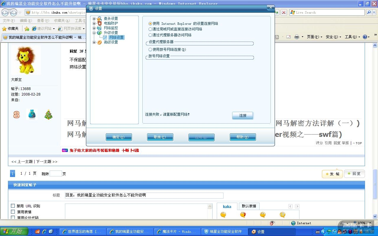 我的瑞星全功能安全软件不能升级啊,更新日期6月21日,我点自动升级总显示获取升级文件失败,请你换其他时间段尝试。我点升级设置里的网络设置,总是连接失败,请重新配置网络,谁教教我怎么弄啊