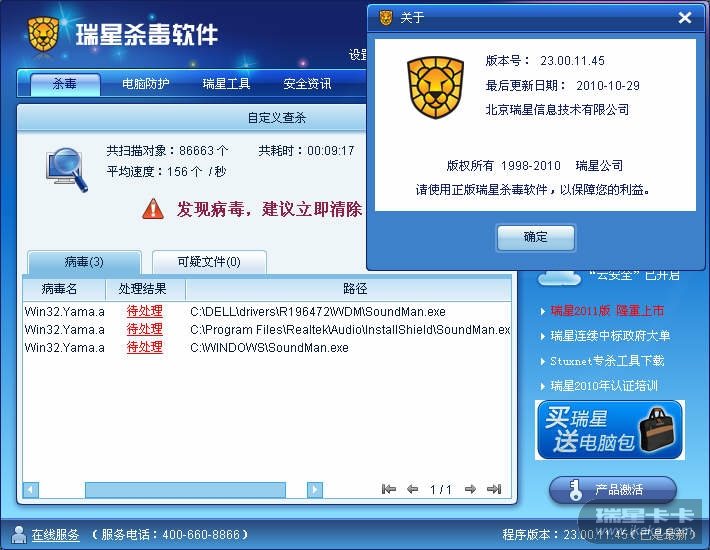 感觉2011版用一个词来形容就是大开杀戒!昨天用最新版的Microsoft Security Essentials、卡巴斯基、金山毒霸扫描为正常的文件(几个注册机,1个声卡驱动文件),瑞星都认为是病毒!还有其他11个貌似“可疑”的文件更是胡说八道(包括搜狗输入法的2个DLL文件、渤海证券交易软件的文件等等)!