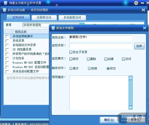 如图,系统内核加固中,点击模板/修改,其中有文件访问,注册表访问,系统底层访问,点击添加,可以自由添加规则。