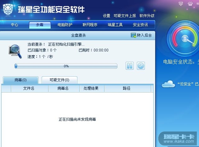 我用瑞星全功能安全软件2011版本在安全模式下进行病毒扫描,可是打开瑞星杀毒软件扫描时,一直出现正在初始化扫描引擎,一直就卡着不动。多次尝试也是不行,把瑞星杀毒软件进行修复后,在安全模式无法进行病毒扫描。在正常模式下可以进行病毒扫描。
