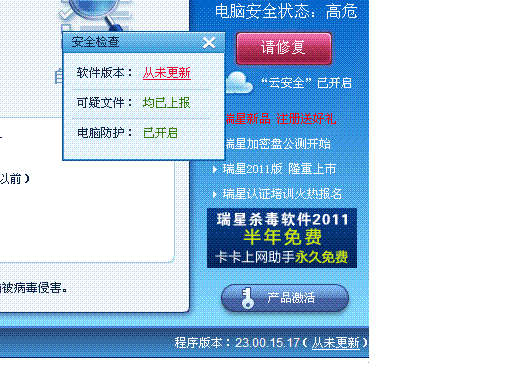 经过杀毒后显示没有病毒。伞是绿色的。可是电脑安全状态提示高危。提示说升级,我点软件升级后,出现升级框。可一到连接瑞星服务器就一闪后关闭了。接着什么反应都没有。services.msc已经查过是启动的。也重新装过新的了。我现在用的是在别的电脑上升级后用U盘考的安装包装的。在别的电脑上用的很好。现在真不知道怎么弄了。谁告诉我下。谢谢。