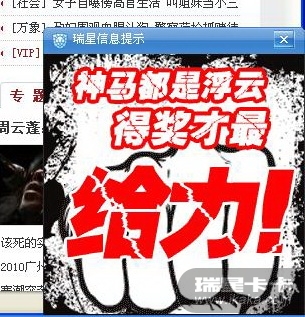 呵呵~~这个我也出现过。昨天晚上。 跟360安全卫士一样。360安全卫士也会弹出这种。迅雷也是。不过迅雷是下载工具,会有广告那是没什么。 瑞星是安全软件,弹出这种,那真得得反思了。