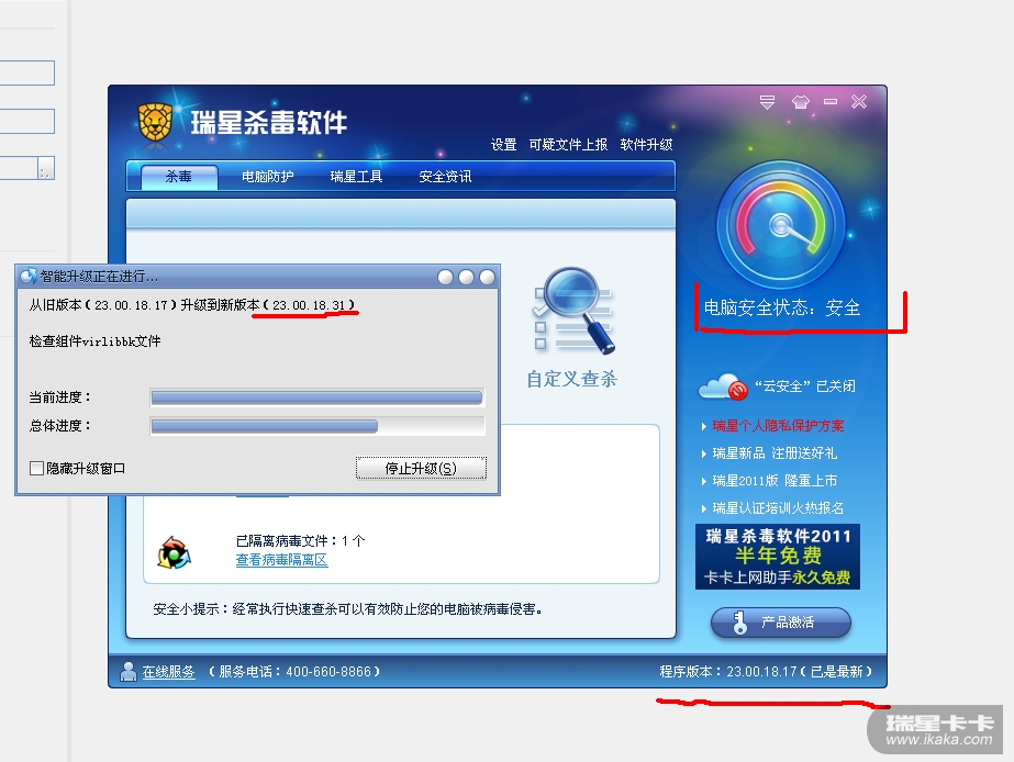 我的也是刚刚才发现有这个问题的,打开瑞星界面时在右下角看到提示是版本已是最新,结果一按“软件升级”就开始升级了,刚开始我还以为等一下会自动提示已是最新,结果真的升级了,这说明初时打开瑞星界面看到的“版本已是最新”肯定有错了,我也是设置了“即时升级”的,在“静默升级”前打了勾,。
