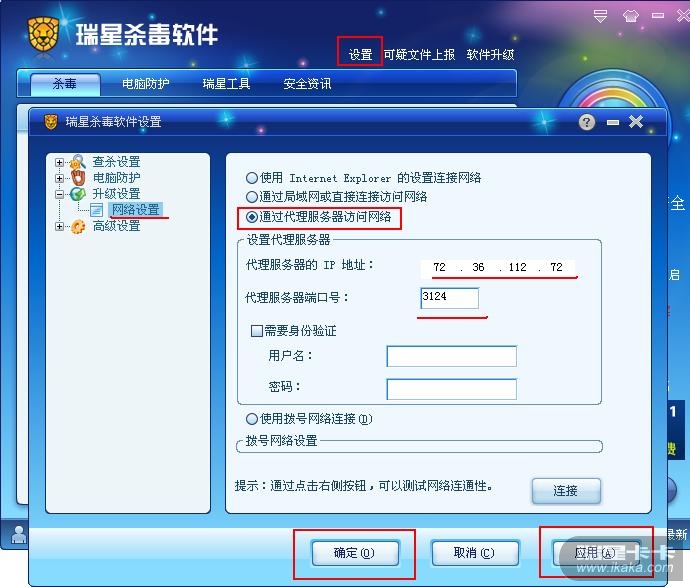 2.还是不行的话,可以按照下图的做法:设置-升级设置-网络设置-选择通过代理服务器访问网络。方框里按照图示的数据来填,最后别忘了点确定和应用。