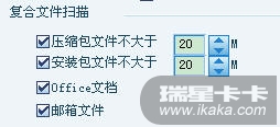 如上图所示,大于20M的压缩包文件和大于20M的安装包文件是不扫描的。这样设置可以提高扫描速度。但请注意,如果“压缩包文件不大于··”和“安装包文件不大于··”不勾选的话,瑞星杀毒软件是不扫描所有的压缩包的和安装包文件的。
