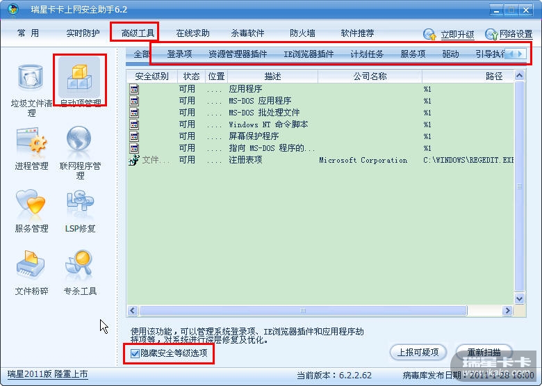 2 仅使用活跃记录是2011版瑞星杀毒软件的一大特色。勾选“仅使用活跃记录”的话,瑞星仅使用近期活跃的病毒的病毒库(保存着病毒的特征码)进行扫描,这样可以大大提升扫描速度。对于近期活跃的病毒的判断规则可能是根据用户云安全上报,可疑文件上传,蜜罐系统,爬行蜘蛛(搜集网马)等方式,具体使用什么方法只有开发的工程师才知道。当然,对于常见的病毒,勾选这个选项的话还是可以查杀的。