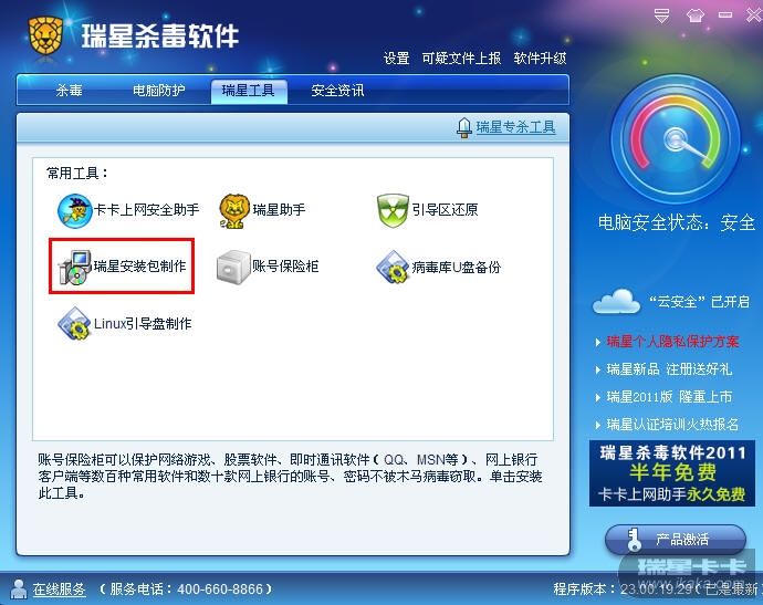 你可以制作瑞星安装包,这样你重装系统后,就不用再另外下个瑞星来安装,也不用再根据自己的喜好设置一遍了。
