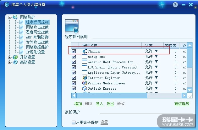 打开瑞星防火墙-设置-网络防护-联网程序控制