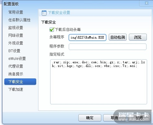 以迅雷为例,点配置—>下载安全—>在下载后自动杀毒那打勾,点自动检测就会自动帮你检测到瑞星的了,在点应用、确定就可以了。