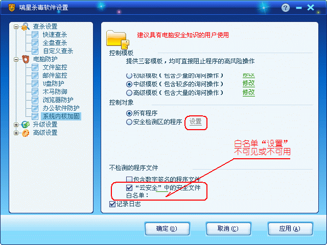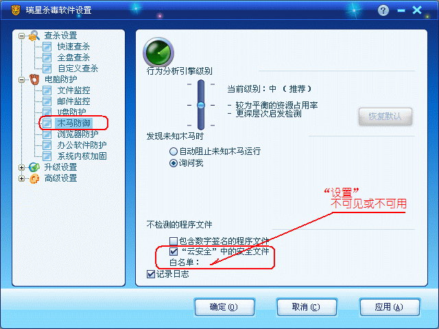 Rav2011 在 “木马防御” 与 “系统内核加固” 设置界面里的白名单 “设置” 按钮不可见或不可用(后附截图)。
