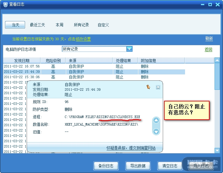 日志中的记录是您在做什么操作时提示的?请提供您的 瑞星软件版本号,右击托盘处监控绿伞/查看日志/备份日志,将日志导出后上传。