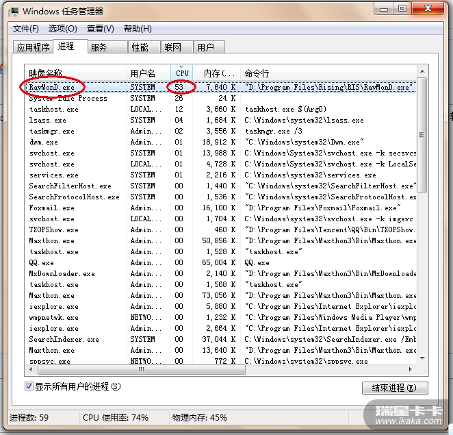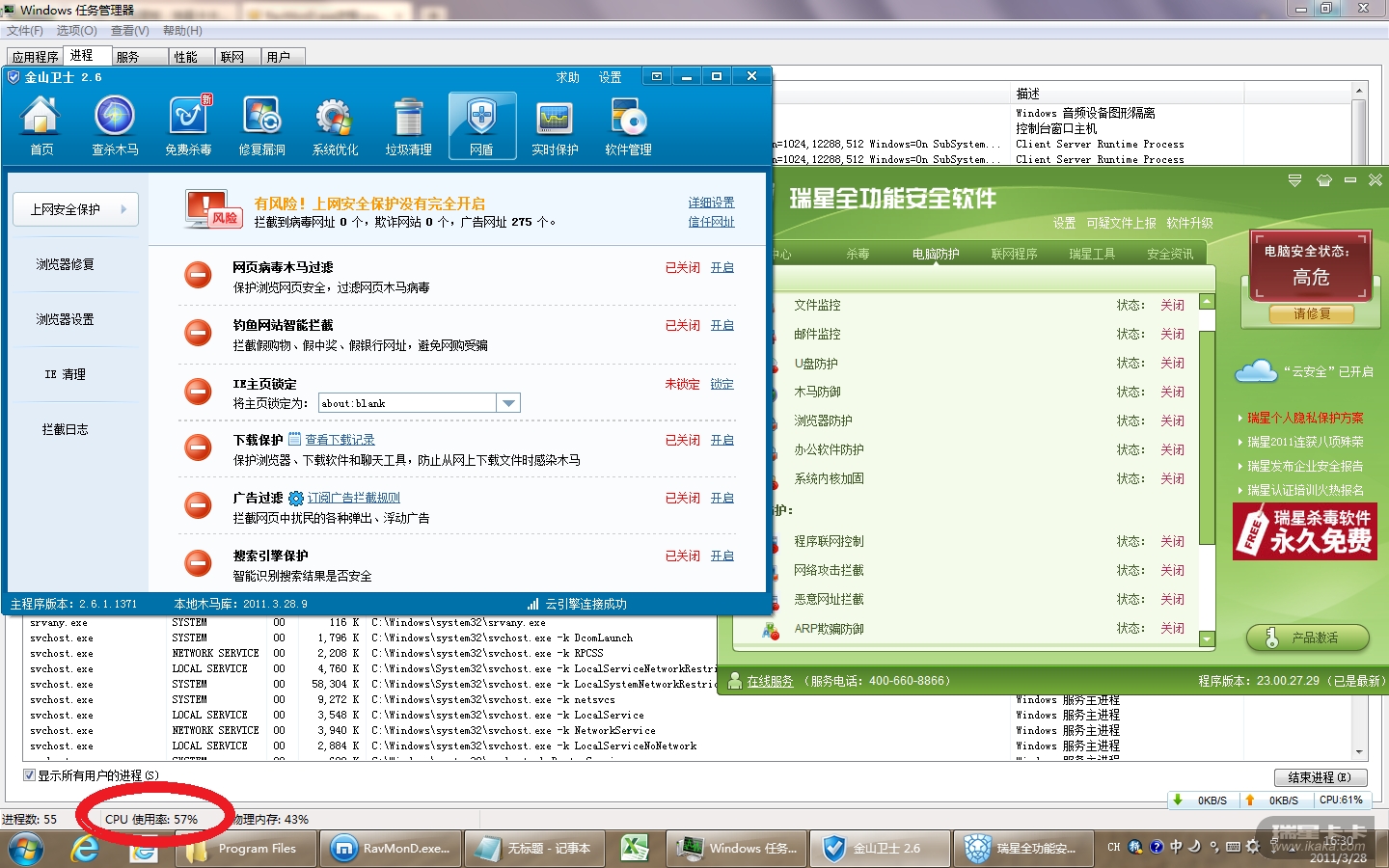 2011/3/28 16:36 再次补充:从开机后即出现cpu占用率高的问题,查io、注册表读取都在正常水平,关闭所有个人软件,关闭金山卫士、关闭瑞星监控,RavMonD.exe仍不能恢复正常。另附上所有进程截图。