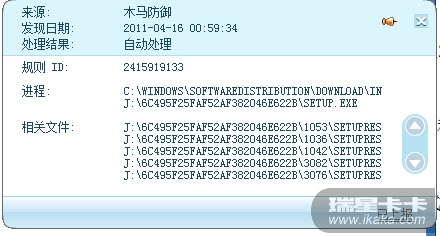 关闭了瑞星所有监控功能,仍不能安装其更新。检查瑞星“查看日志”,看到了阻止其更新的记录,说是植入木马。无奈卸载瑞星,结果