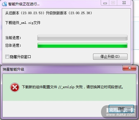 点击开始/运行,输入%temp%,回车,清空该文件夹内容后重新升级,如无效,请运行附件中的工具,将在系统盘根目录下生成的Rs_Ulog文件夹压缩后上传。