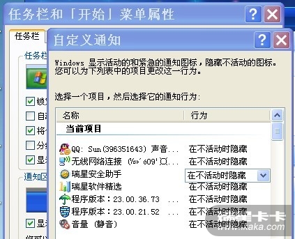 鼠标右击任务栏空白地方-属性-自定义-点击卡卡助手等在下拉菜单选择总是隐藏