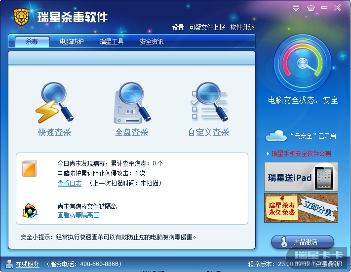 我开始用的是盒装的瑞星,自从免费后,老弹出广告,最近升级到最新版本,机子无法正常关机了,总在正在关机的地方卡死,我重装了N遍系统,没用,后来试着卸载瑞星才发现这个问题的,让人很失望,我现在都不知道用什么杀毒软件了~