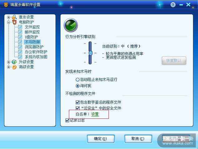 文件监控设置里有不监控目录 添加,木马防御设置有白名单 添加。