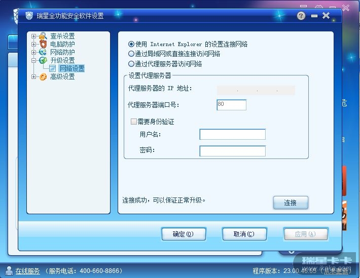 日开始升不了级了,原来装的是杀毒和防火分开的,今天重新安装了瑞星全功能安全软件也是一样啊!升级设置的网络连接测试都正常啊!截图如下