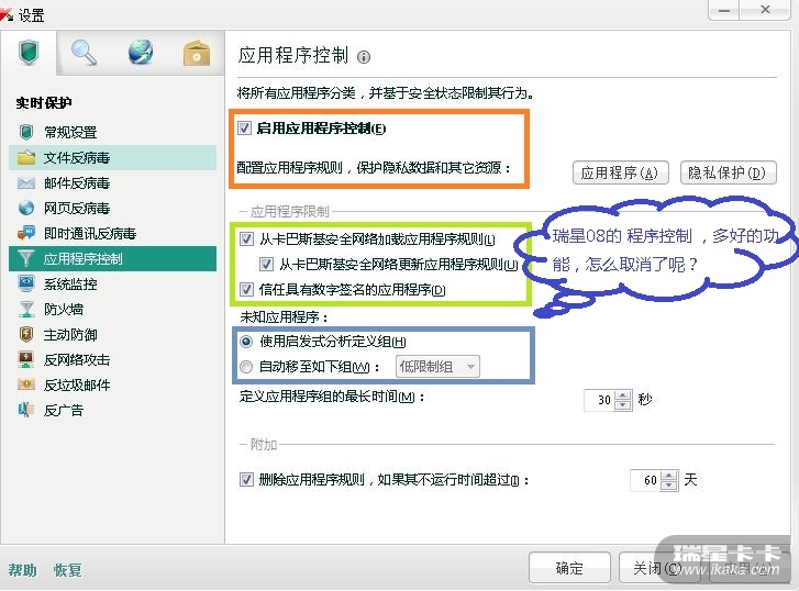 前面也说了,卡巴会将所有的程序都放到程序控制中,并联网判断程序的安全性(云信誉和签名)!