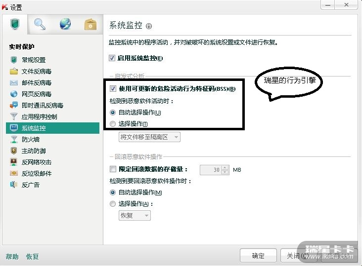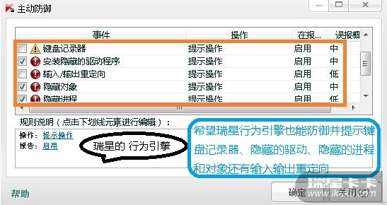 卡巴 防御了键盘记录器、隐藏的驱动、隐藏的对象和进程外加输入输出重定向,这些 若瑞星行为引擎没有,请防御!