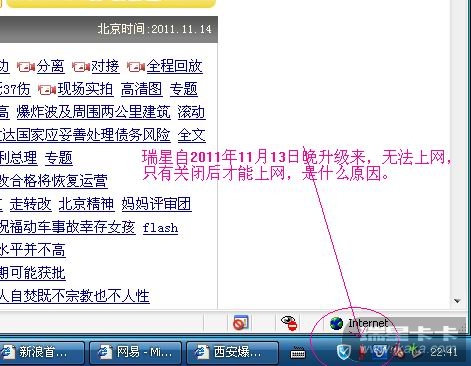 自2011年11月13日瑞星升级后,无法联网,只有禁止瑞星后才正常是什么原因?