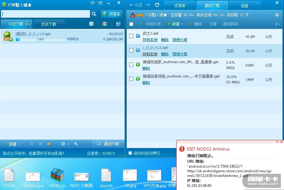 下面网址旋风离线下载后存到本地下载时NOD32右下角出现红色阻止框,金山卫士没提示