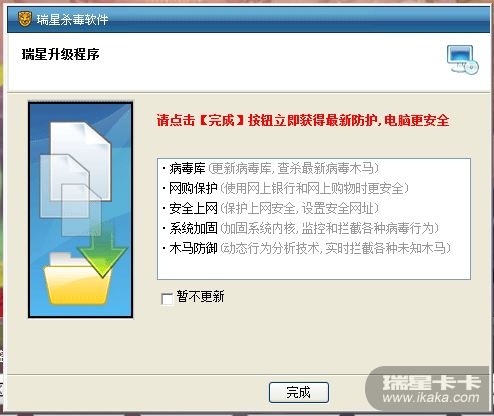 第二个图,我每天一开电脑,第一件事就是升级瑞星。如果你们一定要跳出这个广告,那么,请加上“取消”这个按钮,以前这个窗口在开始栏那还可以右键点关闭,现在连这个都没有了,连任务管理器都没有显示,没法停止运行,我希望这个窗口永远都别出来