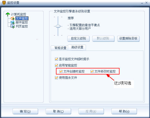 打开杀毒软件/设置/监控设置/文件监控/高级设置,做如图设置: