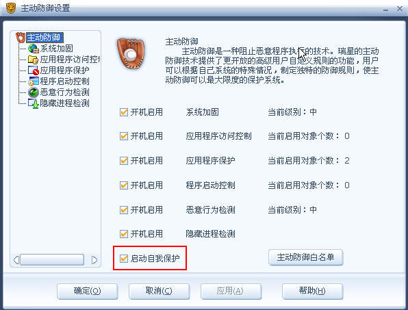 瑞星08版添加了一个叫“自我保护”的功能,因为其位置“隐蔽”,可能很多人都不太注意它。如图: