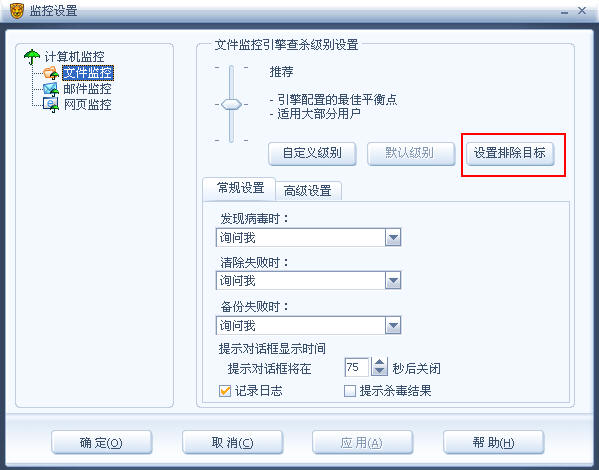 打开杀毒软件/设置/详细设置/监控设置/文件监控/设置排除目标,如图: