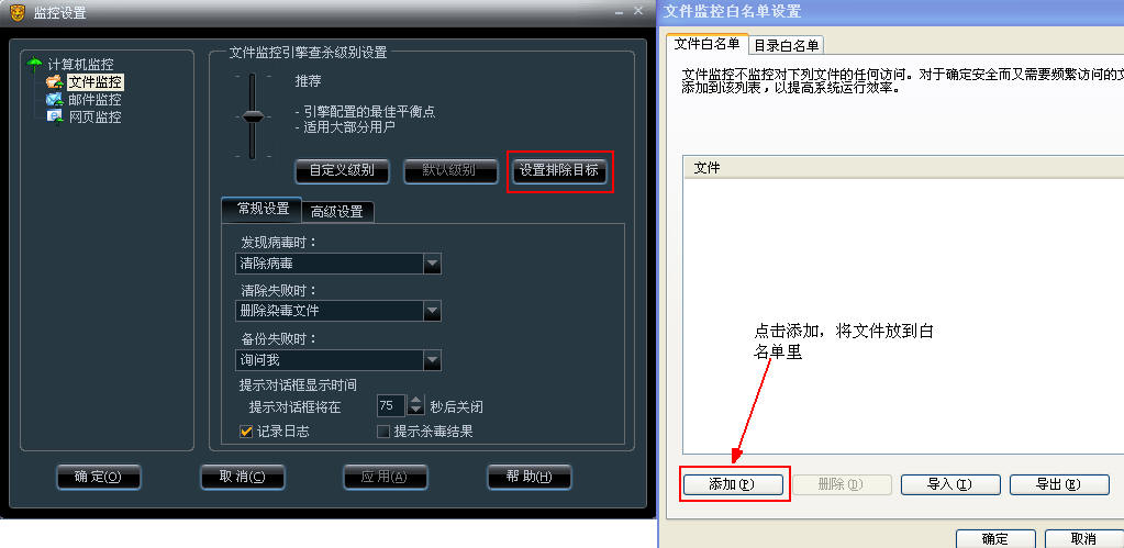2.在正常的使用过程中,瑞星的监控报毒,同样一方面上报瑞星,一方面通过设置不监控该文件,具体设置如图: