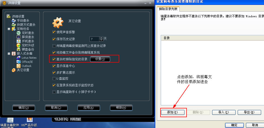 1.杀毒时,杀到了该文件报毒,如果肯定该文件没有问题,一方面上报瑞星,一方面可以设置为杀毒时跳过该文件,具体设置如图: