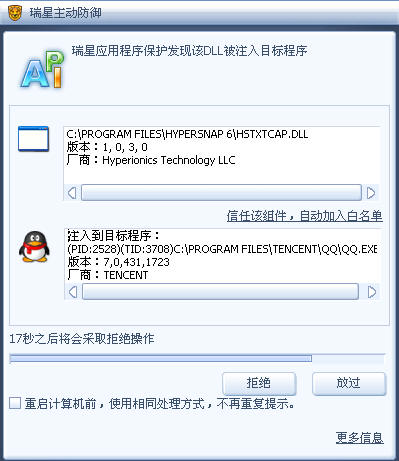 打开杀毒软件/防御/应用程序保护,选择添加,通过浏览,将要保护的程序添加进去,添加后会弹出一个规则界面,注意一定要修改设置的,默认的几个规则都是放过的,改为“拒绝”或者“提示”都可以。改为“提示”的话,在有程序触动规则时会提示。例如:我改为提示后,在登陆QQ的时候会弹出提示,这时候就可以根据提示内容看到是哪个文件在注入,根据其名称和厂商判断该文件是否正常,如果自己无法判断,可以把该文件上传给瑞星分析,看是不是病毒。如图:
