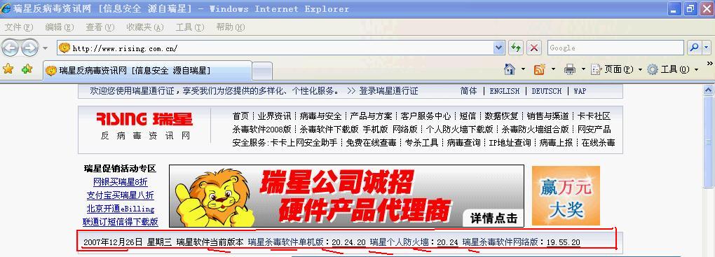 2007年12月26日 星期三 瑞星软件当前版本 瑞星杀毒软件单机版:20.24.20 瑞星个人防火墙:20.24 瑞星杀毒软件网络版:19.55.20