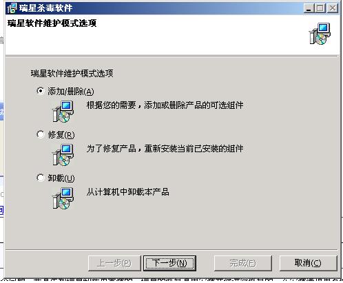 我的瑞星杀软 不能升级 , 提示 读取升级文件配置失败,请使用安装程序中的修复功能修复后在升级。 请高手帮帮忙, 这个修复功能在什么地方,路径,文件夹。